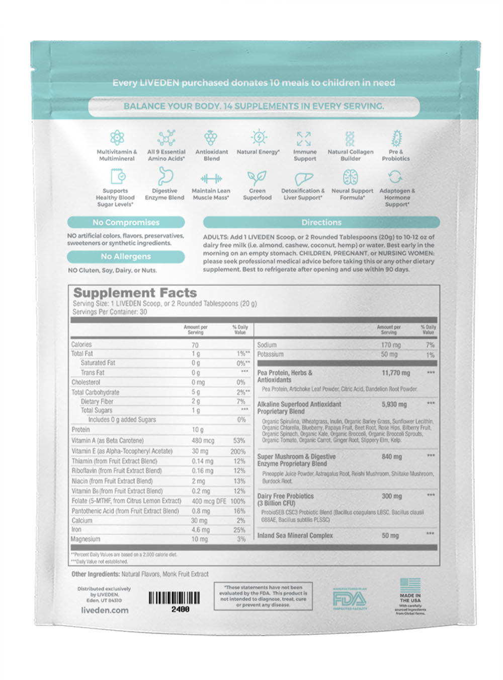 Giving back: We believe every child should have enough food to eat -it's why we've infused our giving with every purchase. For every LIVEDEN BALANCE purchased we donate 10 meals to children in need.